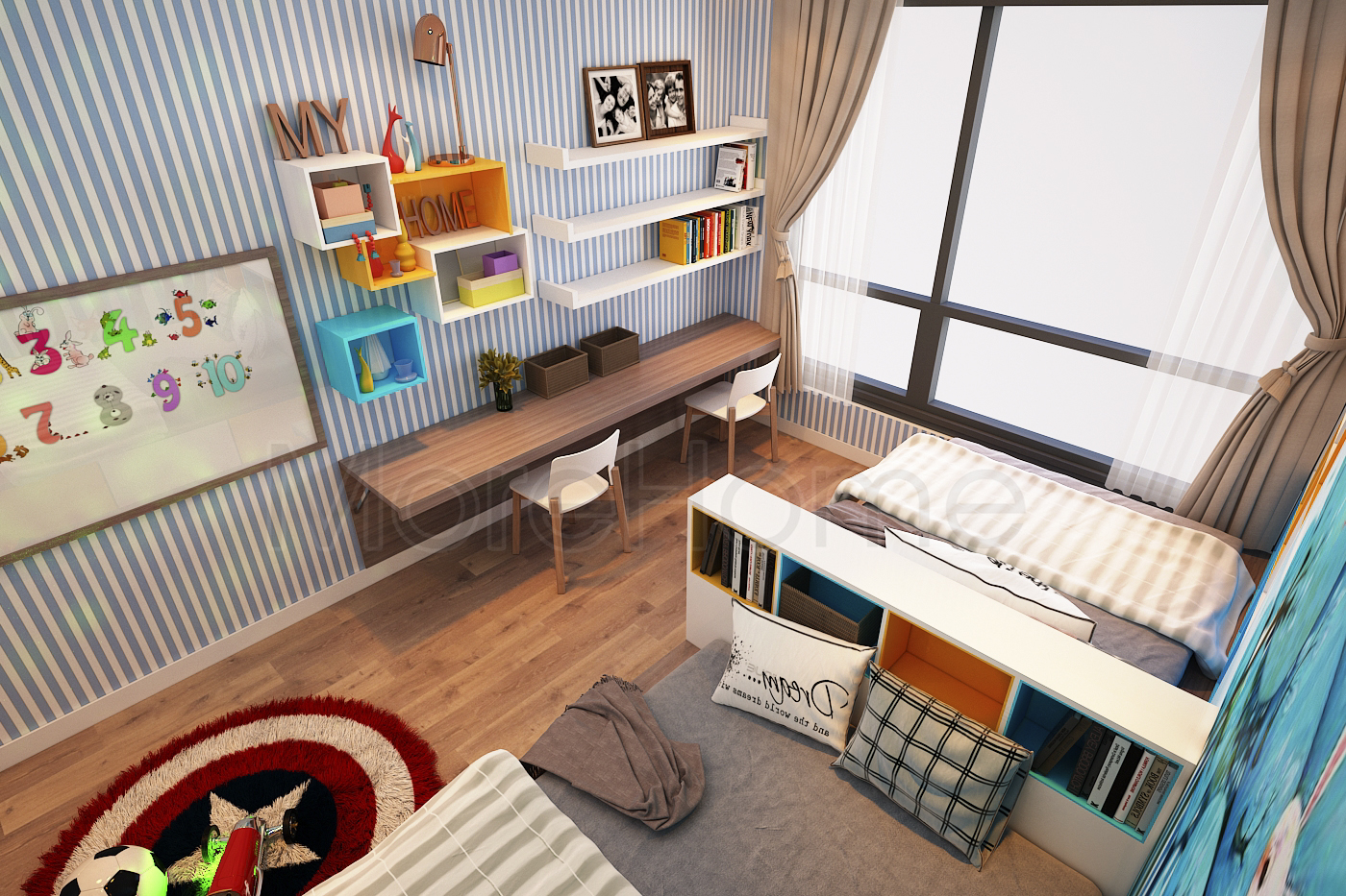 Cuối cùng là thiết kế nội thất phòng ngủ hiện đại. Phòng ngủ Master không quá cầu kỳ về kiểu cách nhưng gây được ấn tượng nhờ thiết kế hướng sáng mang đến hứng khởi và sự thoải mái cho không gian phòng nhỏ. Thiết kế nội thất phòng cho trẻ thì sử dụng linh hoạt màu sắc khác nhau mang đến một không gian phòng ngủ sáng tạo và năng động, tránh sự nhàm chán và lặp lại.