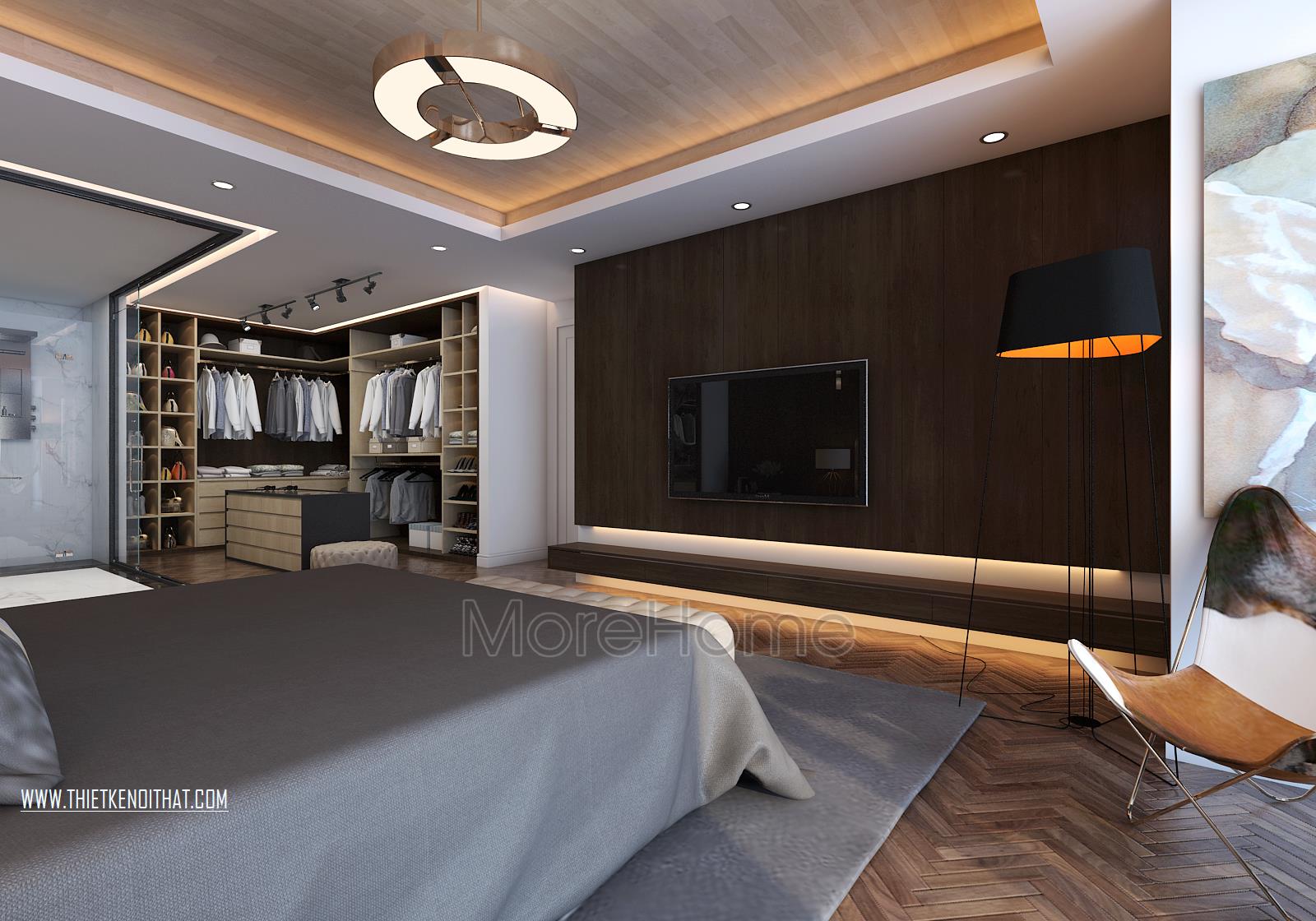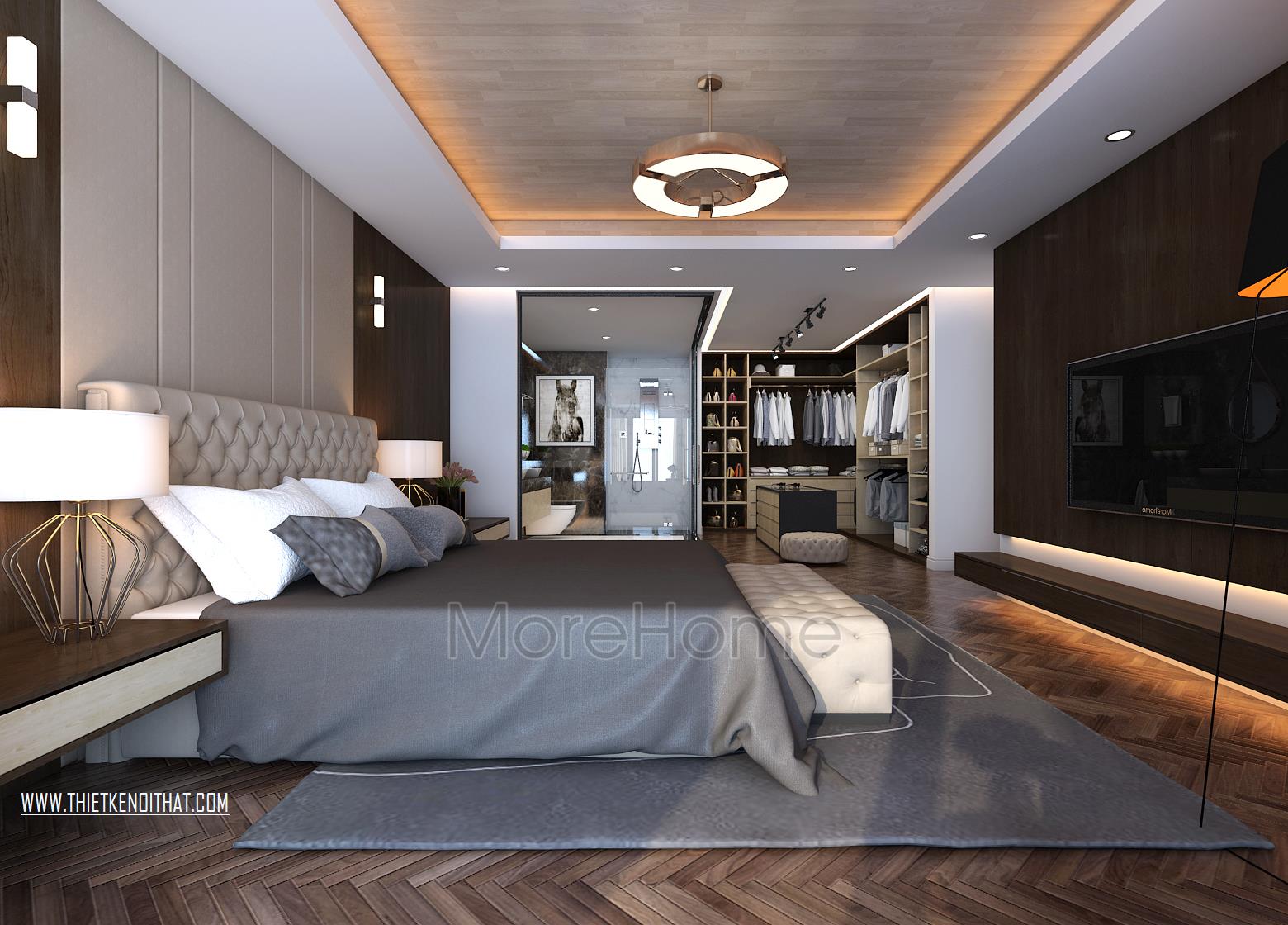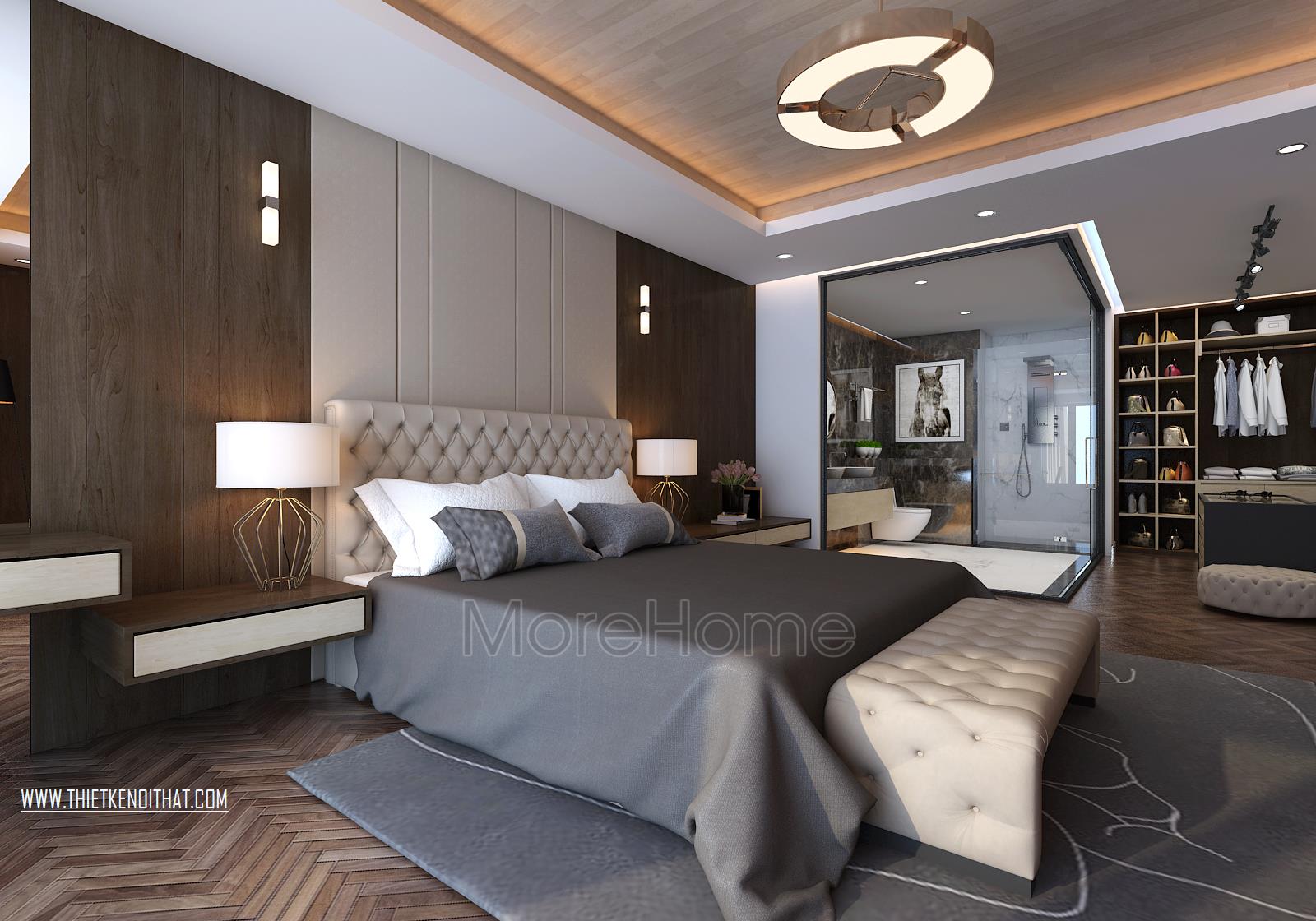 Tiếp đến là thiết kế nội thất phòng ngủ Master phong cách hiện đại. Tone màu ghi sáng và nâu veneer trầm được sử dụng tạo độ cân bằng cho không gian. Thiết kế nhà vệ sinh ngăn cách bởi tường kính cường lực là một trong những dụng ý của tác giả giúp mang đến cảm giác cơi nới về mặt diện tích và giúp tạo ấn tượng sâu sắc về một không gian cách tân sáng tạo. Bên cạnh đó, thiết kế tủ quần sao đa tầng nhiều ngăn với thiết kế không cánh tạo độ mở và tiện lợi hơn cho gia chủ. Điểm cuối cùng đem lại nét đẹp cho căn phòng chính là sự kết hợp hài hòa của ánh sáng, vẻ đẹp ánh sáng được phản chiếu nhẹ nhàng qua từng khung cửa và mang lại hứng khởi cho các thành viên trong gia đình.