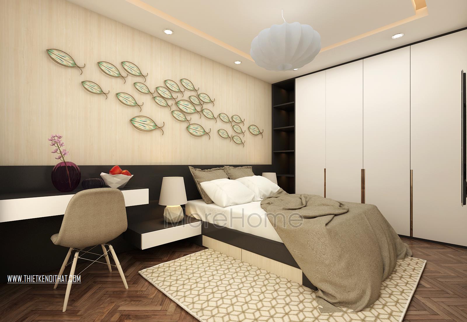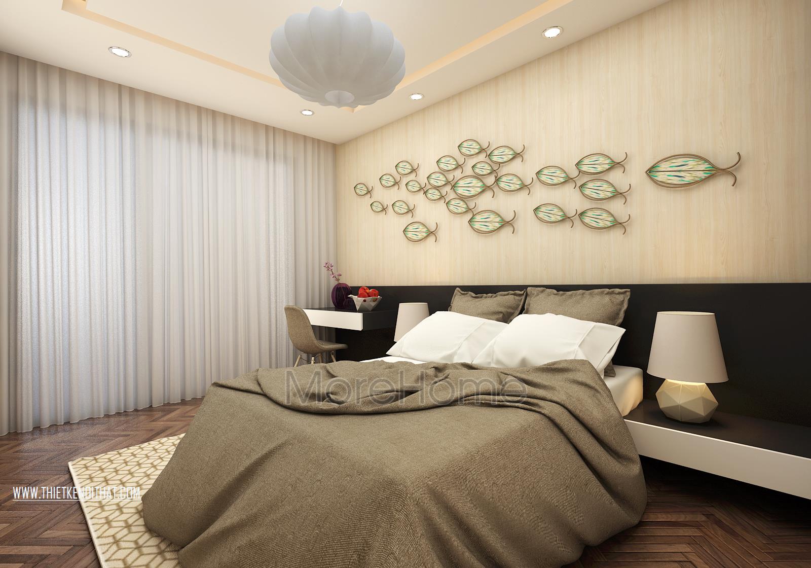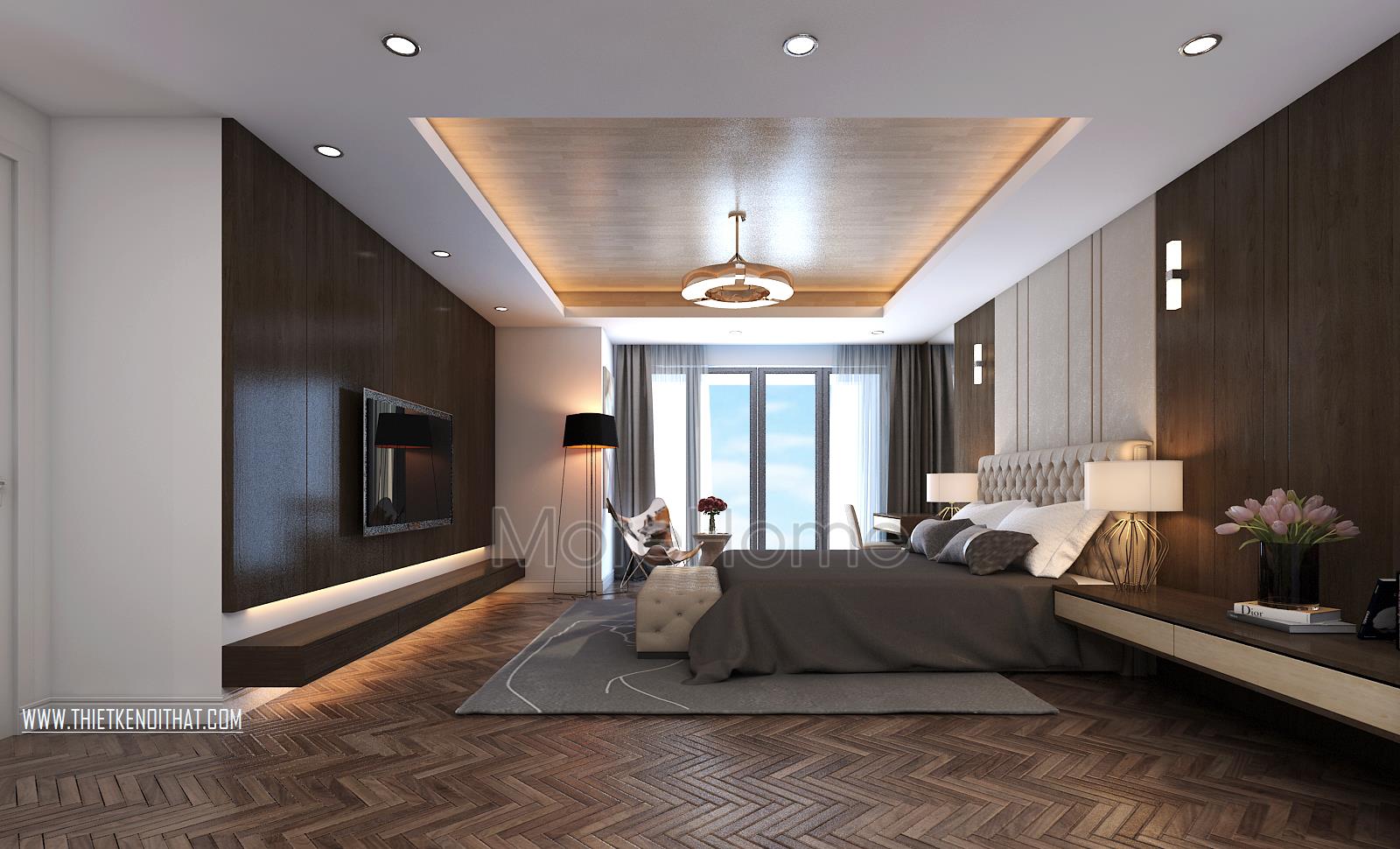 Tiếp đến là thiết kế nội thất phòng ngủ Master phong cách hiện đại. Tone màu ghi sáng và nâu veneer trầm được sử dụng tạo độ cân bằng cho không gian. Thiết kế nhà vệ sinh ngăn cách bởi tường kính cường lực là một trong những dụng ý của tác giả giúp mang đến cảm giác cơi nới về mặt diện tích và giúp tạo ấn tượng sâu sắc về một không gian cách tân sáng tạo. Bên cạnh đó, thiết kế tủ quần sao đa tầng nhiều ngăn với thiết kế không cánh tạo độ mở và tiện lợi hơn cho gia chủ. Điểm cuối cùng đem lại nét đẹp cho căn phòng chính là sự kết hợp hài hòa của ánh sáng, vẻ đẹp ánh sáng được phản chiếu nhẹ nhàng qua từng khung cửa và mang lại hứng khởi cho các thành viên trong gia đình.