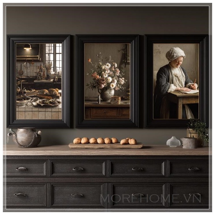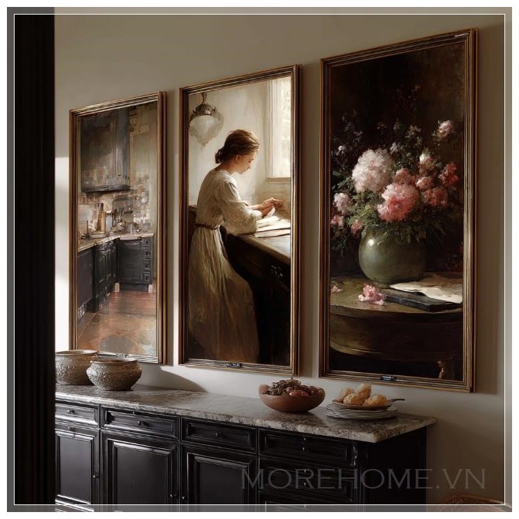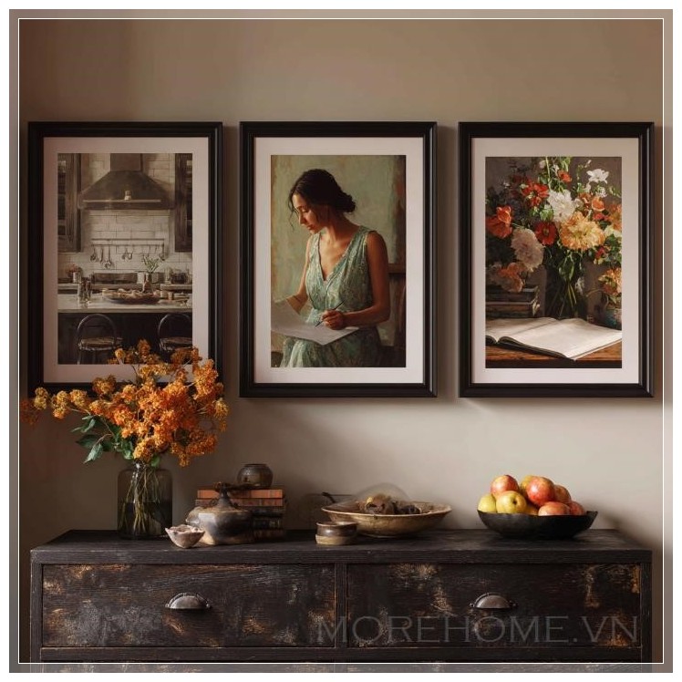 Ba bức tranh tưởng chừng như riêng biệt này lại tạo nên một tổng thể hài hòa khi được treo cạnh nhau trên bức tường, phía trên chiếc tủ gỗ màu tối. Gam màu trung tính chủ đạo trong cả ba tác phẩm tạo nên một nhịp điệu thị giác nhẹ nhàng, không quá mạnh mẽ nhưng đủ để thu hút ánh nhìn và làm dịu tâm hồn người xem. Chiếc tủ gỗ sẫm màu bên dưới như một điểm nhấn vững chãi, làm nổi bật vẻ đẹp mờ ảo và tinh tế của những bức tranh treo phía trên.