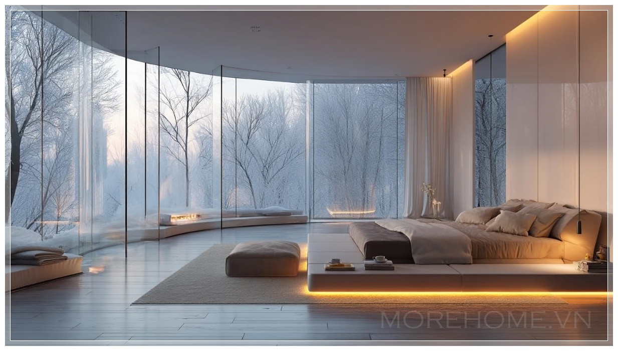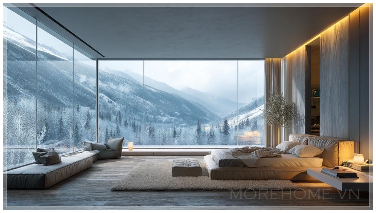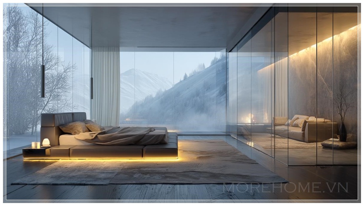 Phòng ngủ này là sự kết hợp hoàn hảo giữa sự sang trọng và tính tối giản, mang đến một không gian yên bình và thư giãn. Với những bức tường kính trong suốt kéo dài từ sàn đến trần, ánh sáng tự nhiên tràn ngập không gian, tạo ra một bầu không khí ấm áp và tĩnh lặng. Cửa sổ kính lớn không chỉ mang đến tầm nhìn tuyệt đẹp mà còn khiến không gian trở nên thoáng đãng và hiện đại.