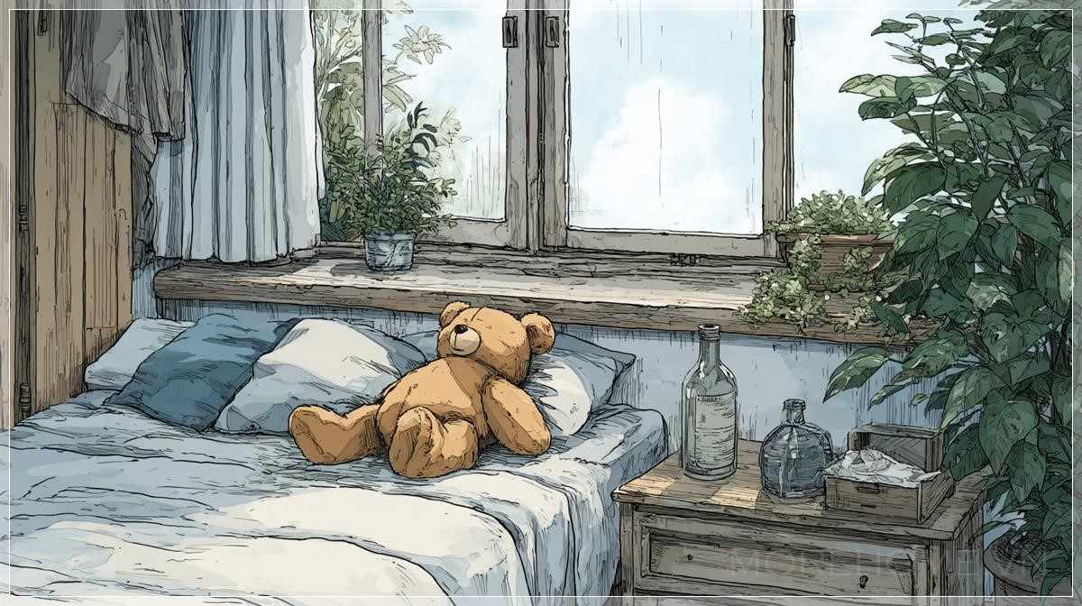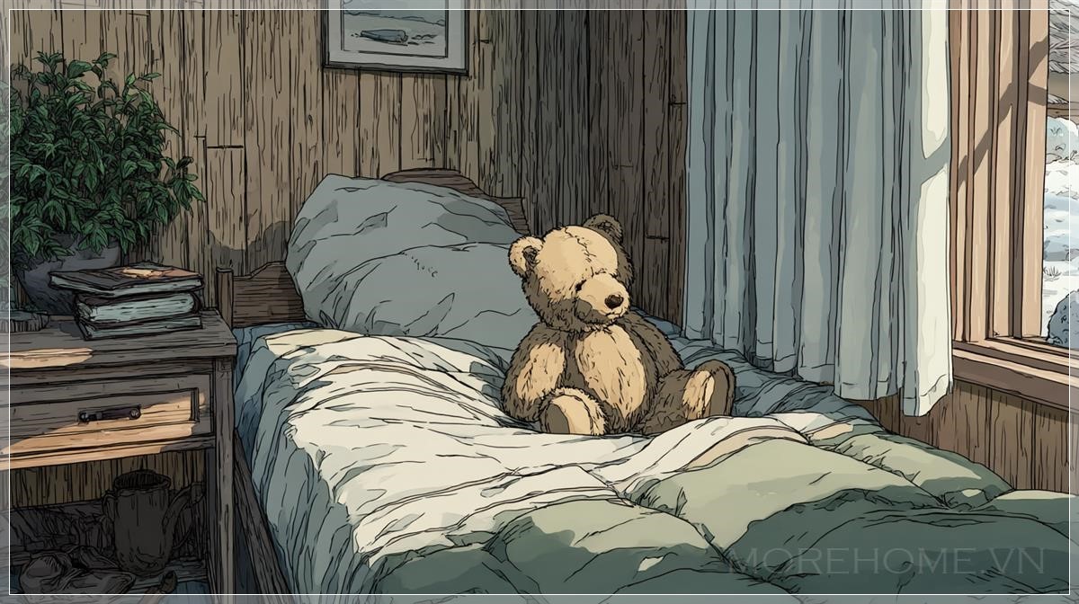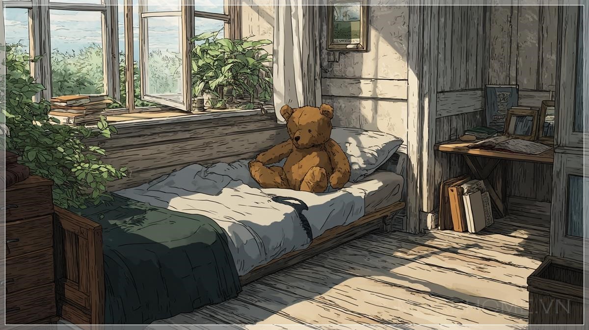 Ánh sáng dịu nhẹ của buổi sáng len lỏi qua cửa sổ, tạo nên một không gian ấm áp và yên bình. Căn phòng được trang trí theo phong cách Studio Ghibli, với những chi tiết đầy mê hoặc, giống như những thước phim hoạt hình yêu thích. Một chiếc giường lớn, phủ chăn bông màu pastel nhẹ nhàng, là nơi gợi lên cảm giác dễ chịu và thư giãn. Trên giường, một chú gấu bông mập mạp nằm bên cạnh, tạo cảm giác thân thuộc, như một người bạn tri kỷ trong những giấc ngủ êm đềm.