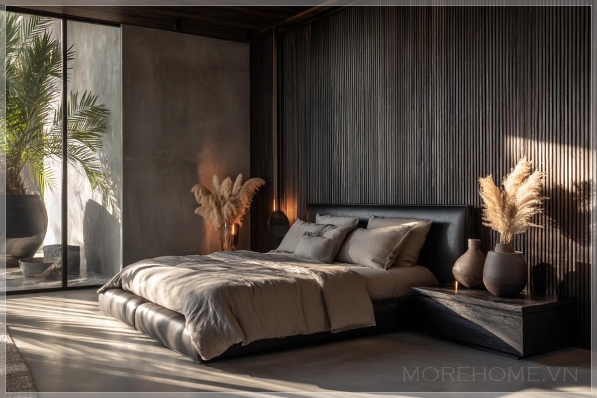 Không gian phòng ngủ mở ra với vẻ đẹp đầy mê hoặc, nơi phong cách South Florida được tái hiện qua từng chi tiết thiết kế, từ ánh sáng dịu nhẹ cho đến chất liệu cao cấp. Một bức tường gỗ tối màu với những thanh nan dọc tạo nên chiều sâu và sự trầm mặc, làm nền hoàn hảo cho chiếc giường với phần đầu bọc da đen bóng bẩy – điểm nhấn đầy mạnh mẽ trong tổng thể hài hòa của căn phòng.