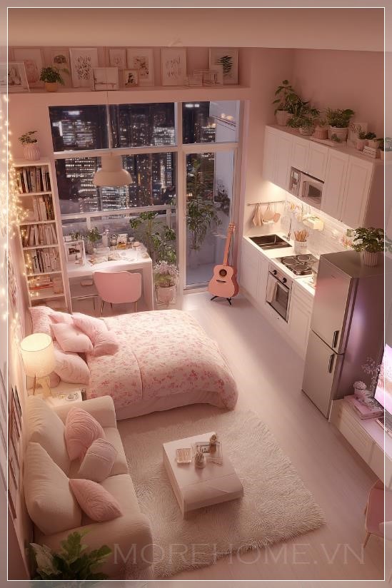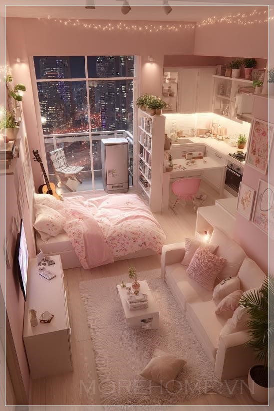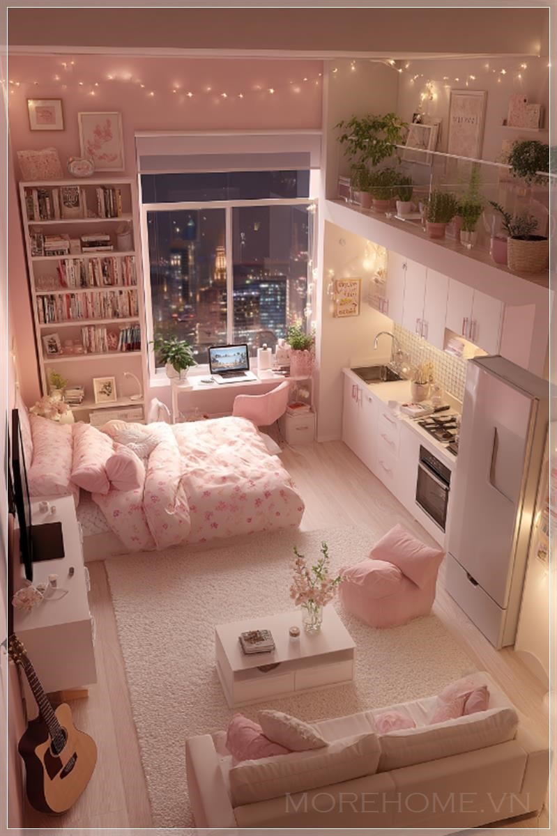 Phía dưới còn có một khu vực tiếp khách ấm cúng, với thảm lông trắng mịn màng, ghế sofa be và những chiếc gối ôm hồng, cùng chiếc bàn cà phê nhỏ xinh ở phía trước. Đối diện là chiếc tivi và một tủ lưu trữ trắng, với những món đồ trang trí đơn giản nhưng đầy cá tính. Một cây guitar màu hồng được đặt bên cạnh, tạo nên một điểm nhấn dễ thương và nghệ thuật cho không gian.