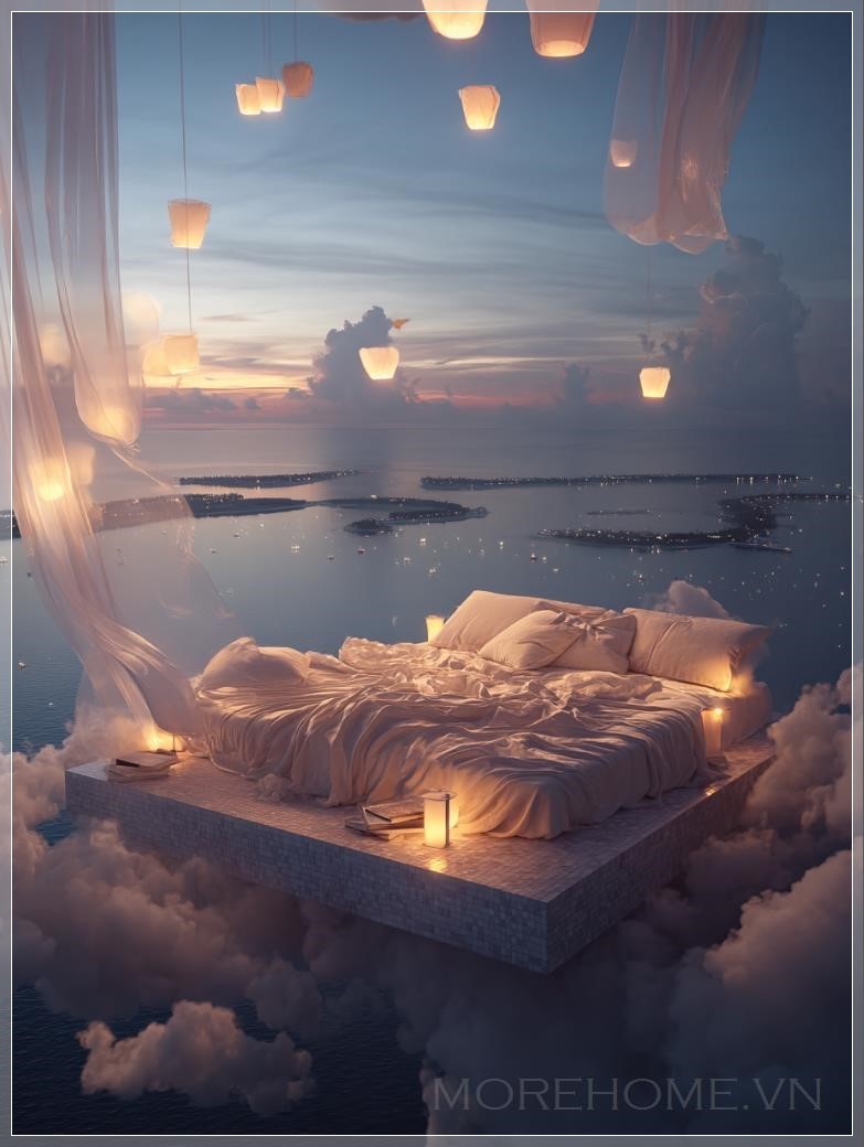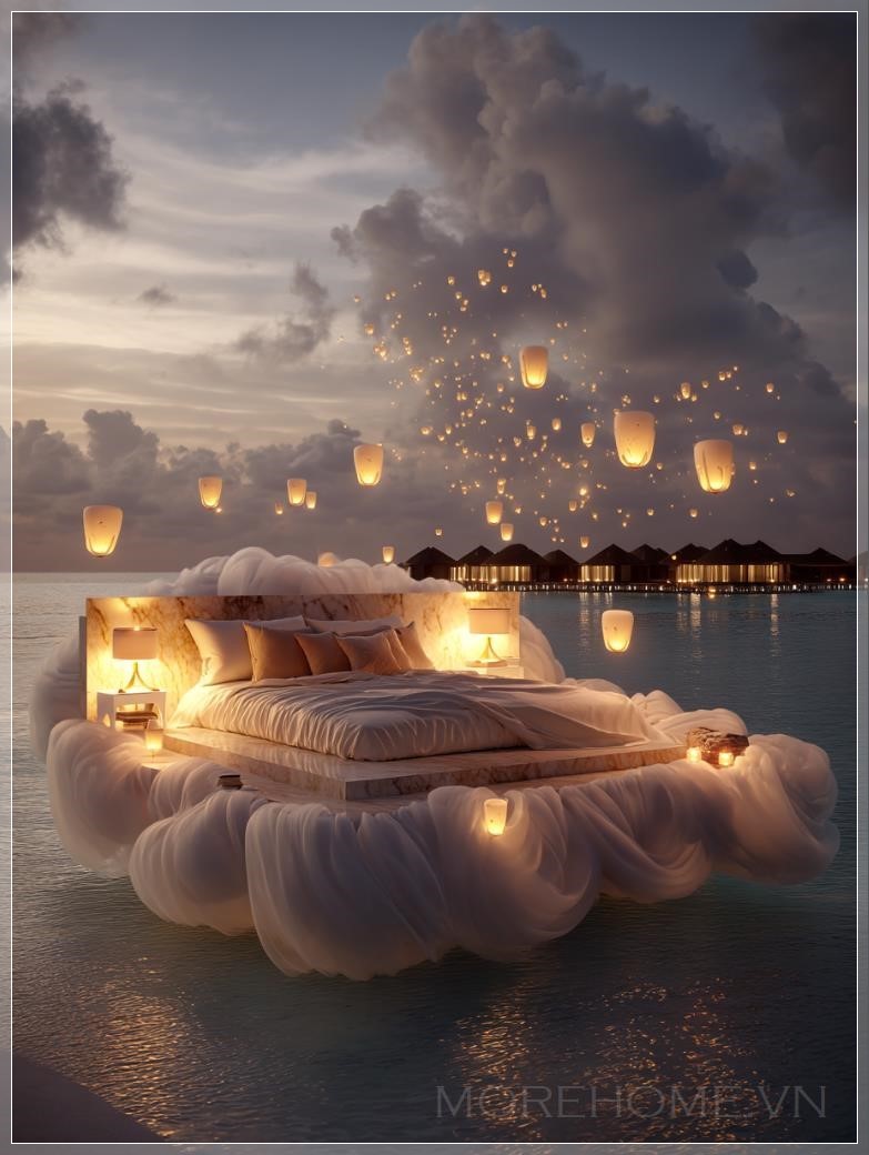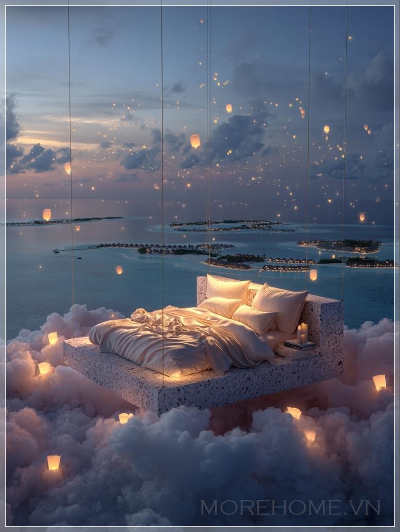 Giường nằm trên một đám mây khổng lồ, uốn lượn như sóng nước, chao đảo nhẹ nhàng giữa không trung. Dưới đó, đại dương bao la của Maldives trải dài bất tận, với những hòn đảo xanh ngát và các atoll hòa quyện trong sắc xanh ngọc bích mê đắm. Từng đợt sóng vỗ về, phản chiếu ánh sáng lấp lánh của các ngọn đèn lồng đang bay xung quanh, tạo ra một không gian kỳ ảo như trong những câu chuyện cổ tích.