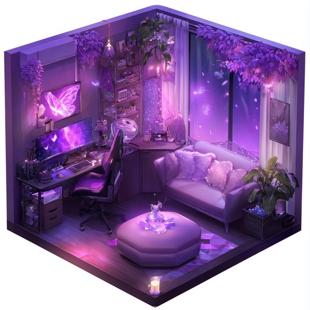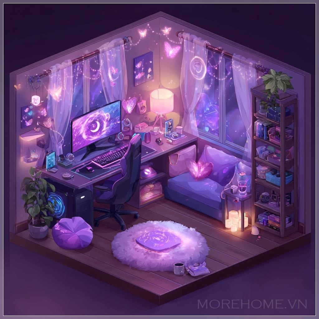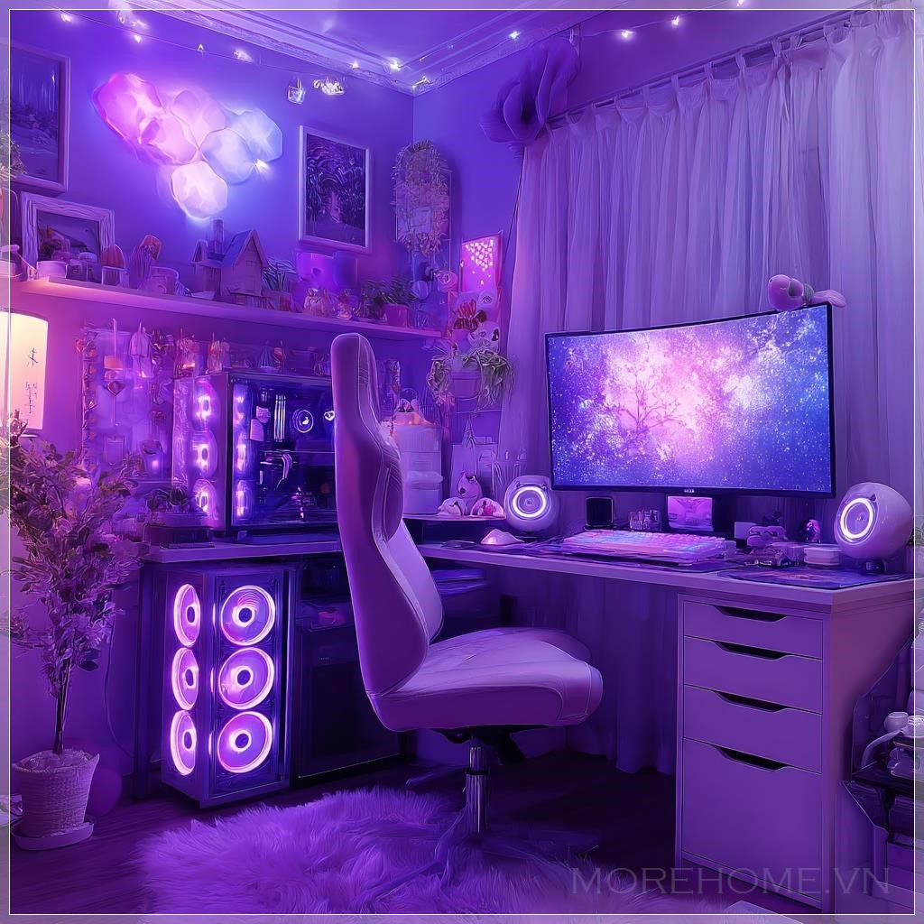 Không gian này sử dụng màu tím làm chủ đạo – một gam màu mang lại cảm giác thư giãn nhưng cũng đầy lôi cuốn. Cửa sổ lớn cho phép ánh sáng tự nhiên chiếu vào, tạo cảm giác thoáng đãng và rộng rãi. Những chiếc đèn led mềm mại quanh phòng không chỉ giúp tạo điểm nhấn mà còn có thể điều chỉnh màu sắc tùy theo tâm trạng, từ tím mơ màng đến hồng nhẹ nhàng. Bộ ghế bọc nỉ màu tím đậm kết hợp với bàn làm việc hiện đại, được trang trí với những vật dụng nhỏ xinh tạo nên một không gian làm việc không chỉ hiệu quả mà còn tràn đầy cảm hứng sáng tạo.