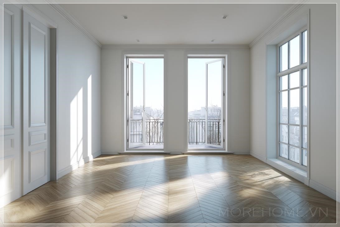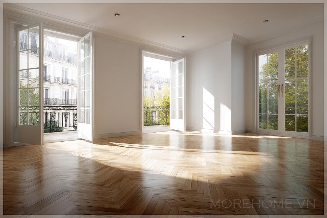 Với một phòng có diện tích 6x8 mét, được chia thành hai khu vực mở rộng lớn, nơi có hai cửa ra sân thượng rộng 2 mét mỗi cửa, khoảng cách giữa chúng là 1 mét. Việc sử dụng gỗ tự nhiên trong thiết kế sàn nhà với kiểu dáng ván lát xương cá, kết hợp với ánh sáng tự nhiên từ các cửa sổ, tạo ra một không gian thoáng đãng và thoải mái. Không gian này sẽ không bị gò bó bởi các yếu tố trang trí phức tạp, mà thay vào đó, sự đơn giản và tính tiện ích sẽ tỏa sáng.