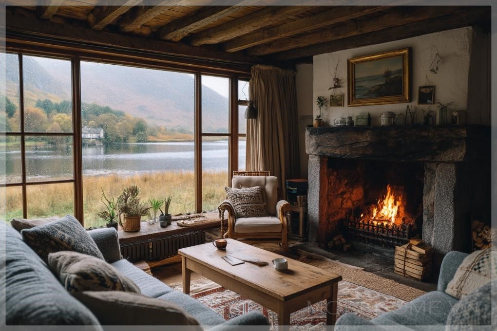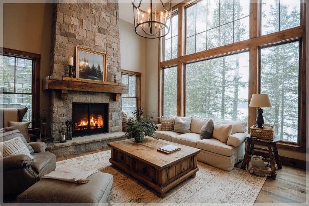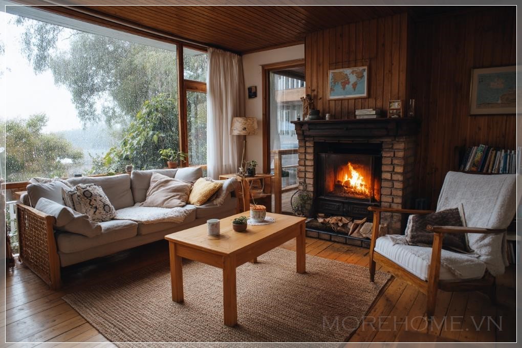 Lò sưởi là điểm nhấn quan trọng trong thiết kế, mang lại cảm giác ấm áp và thư giãn cho không gian phòng khách. Dù bên ngoài trời mưa, không khí trong nhà vẫn luôn dễ chịu nhờ vào ngọn lửa nhỏ ấm áp từ lò sưởi. Đây cũng là một yếu tố giúp không gian trở nên thật sự ấm cúng, là nơi lý tưởng để các thành viên trong gia đình ngồi quây quần bên nhau. Cửa sổ lớn giúp kết nối không gian trong nhà với thiên nhiên bên ngoài, mang ánh sáng tự nhiên vào phòng, đồng thời cho phép mọi người có thể thưởng thức cảnh mưa bên ngoài.