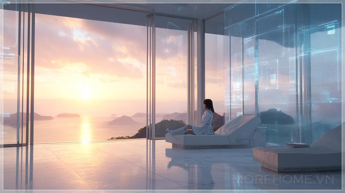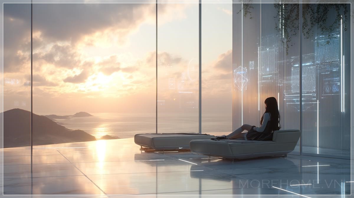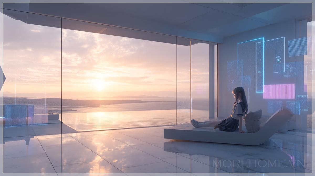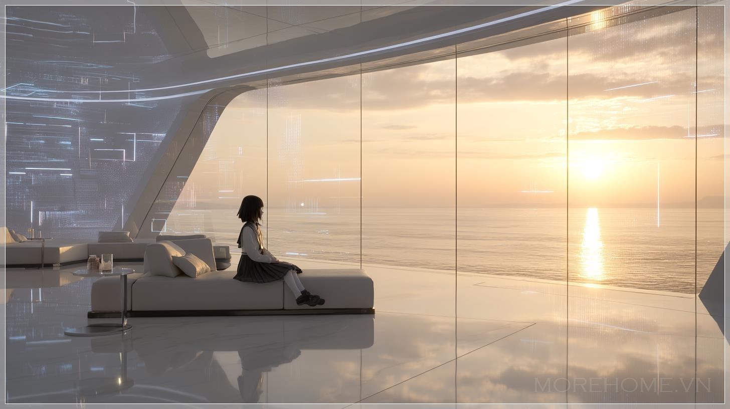 Biệt thự này, với những bức tường kính và cấu trúc titan, tạo ra một không gian sống mở rộng ra ngoài. Cửa sổ kính lớn mang lại tầm nhìn tuyệt vời ra bãi biển, nơi ánh hoàng hôn dần buông xuống, nhuộm màu vàng cam dịu nhẹ khắp căn phòng. Mặt sàn bằng đá marble bóng loáng phản chiếu ánh sáng tự nhiên, làm nổi bật sự tinh tế của không gian. Hệ thống chiếu sáng mềm mại, kết hợp cùng các tấm holographic UI trên tường, tạo nên một không khí ấm cúng và thư giãn. Đặc biệt, ánh sáng tự nhiên phản chiếu lên mái tóc của cô gái, tạo nên những hiệu ứng ánh sáng đẹp mắt, làm tăng thêm phần huyền bí cho bức tranh này.
