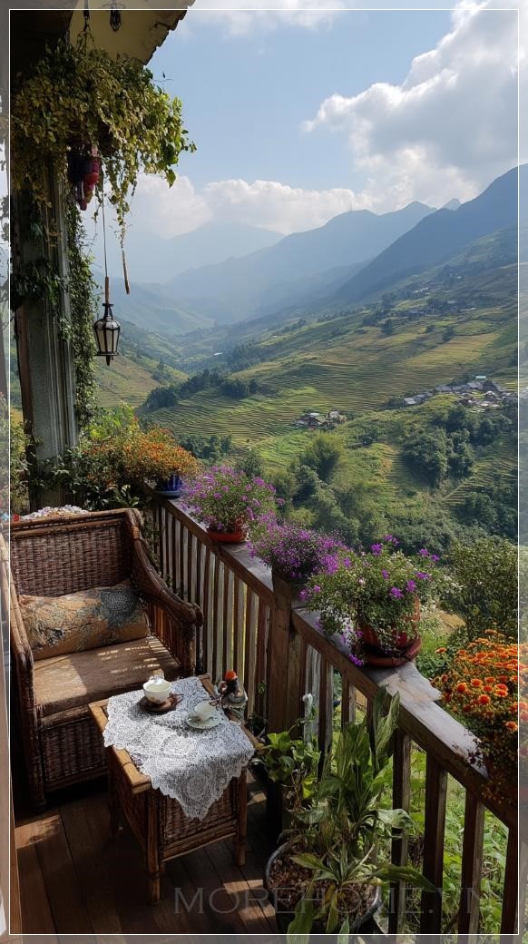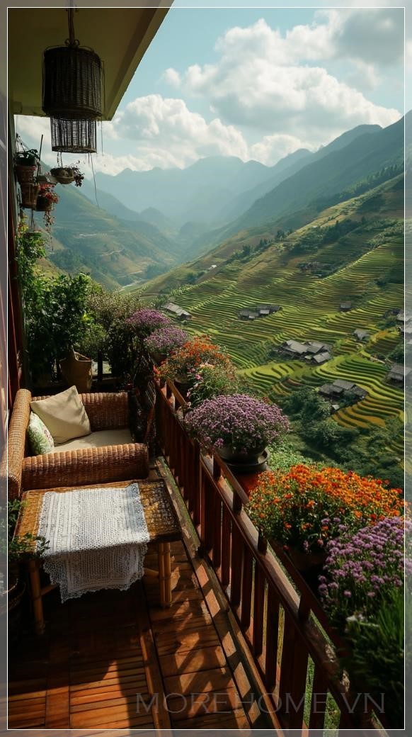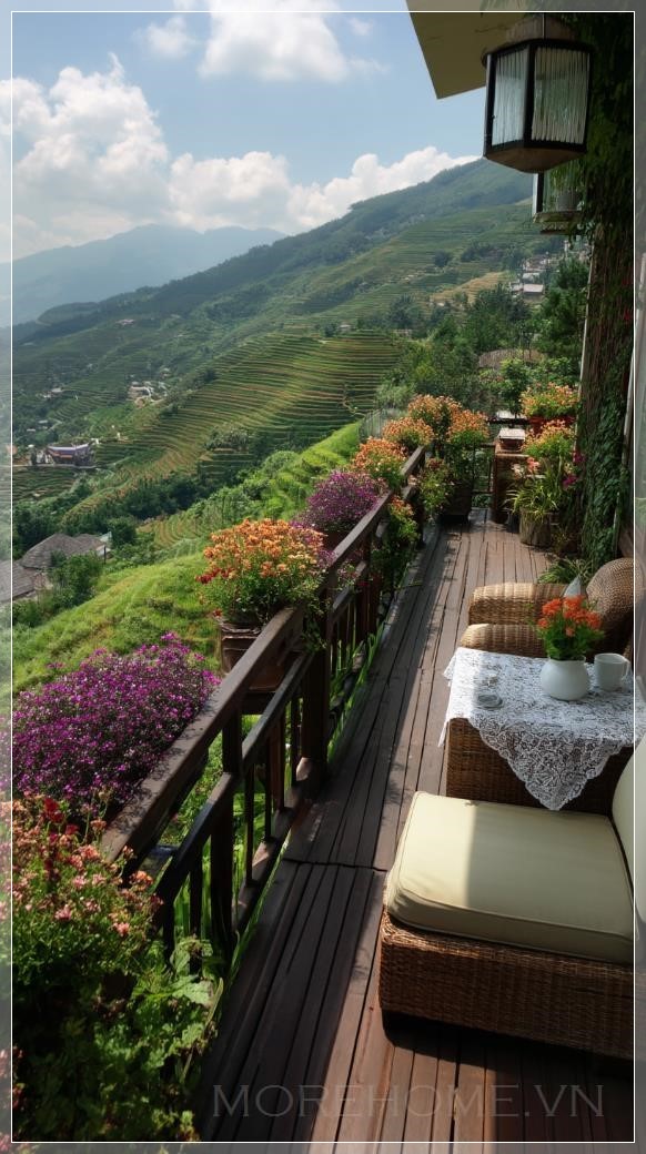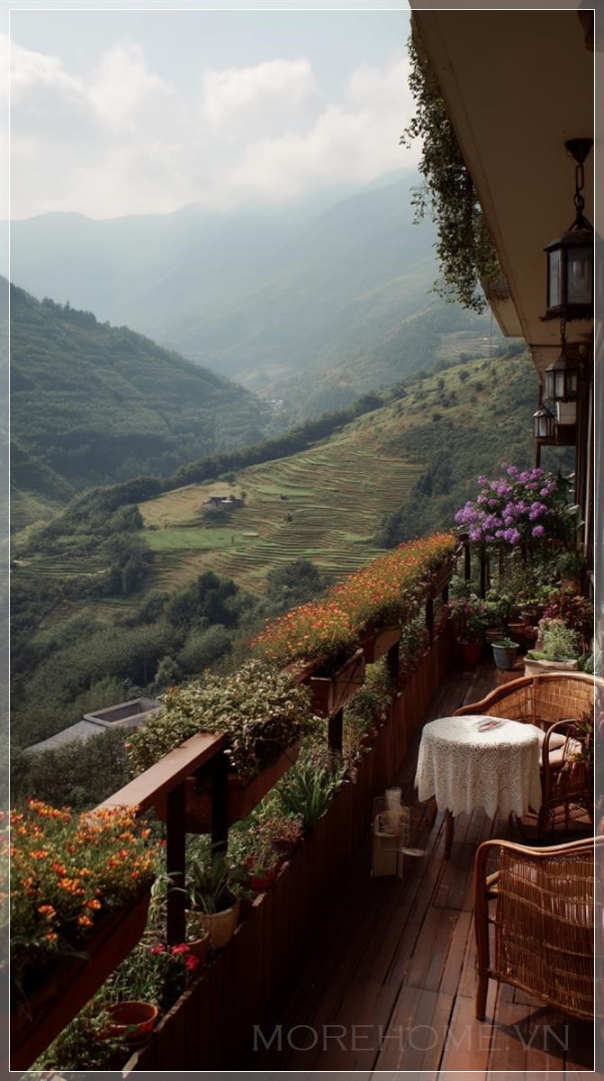 Để thêm phần ấm cúng, một chiếc đèn lồng treo trên lan can mang lại ánh sáng mềm mại, làm dịu đi không khí xung quanh. Những tia sáng nhẹ nhàng từ đèn lồng kết hợp với ánh nắng tự nhiên trong những ngày trời đẹp tạo ra một không gian sáng tạo, dễ chịu. Ánh sáng này không chỉ giúp tô điểm cho không gian mà còn tạo ra bầu không khí ấm áp và thân thiện.