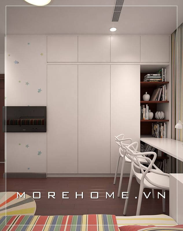 Tủ áo hiện đại tích hợp với kệ sách luôn là xu hướng được đông đảo khách hàng lựa chọn, gam màu trắng nhẹ nhàng mang lại cảm giác tinh tế, ấn tượng hơn cho cả không gian phòng ngủ trẻ em
